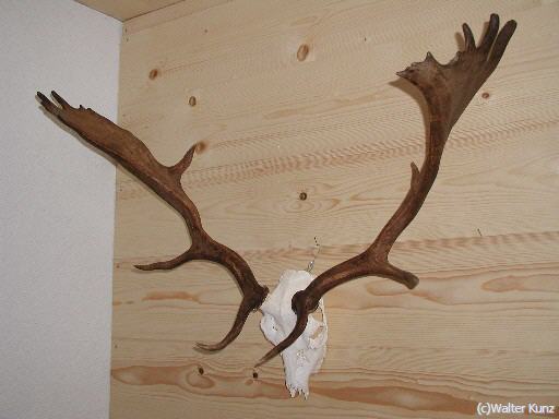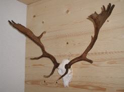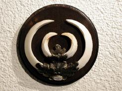 Wildschweinwaffen montiert auf dekorativem Holzbrett |